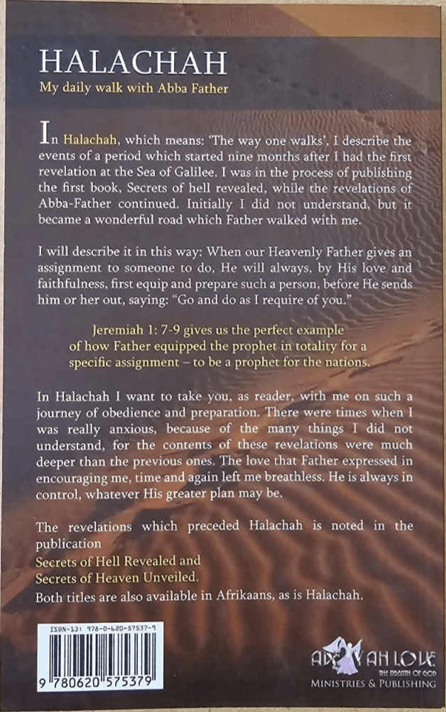 In Halachah, which means: ‘The way one walks’, I describe the events of a period which started nine months after I had the first revelation at the Sea of Galilee. I was in the process of publishing the first book, Secrets of hell revealed, while the revelations of Abba-Father continued. Initially I did not understand, but it became a wonderful road which Father walked with me. I will describe it in this way: When our Heavenly Father gives an assignment to someone to do, He will always, by His love and faithfulness, first equip and prepare such a person, before He sends him or her out.