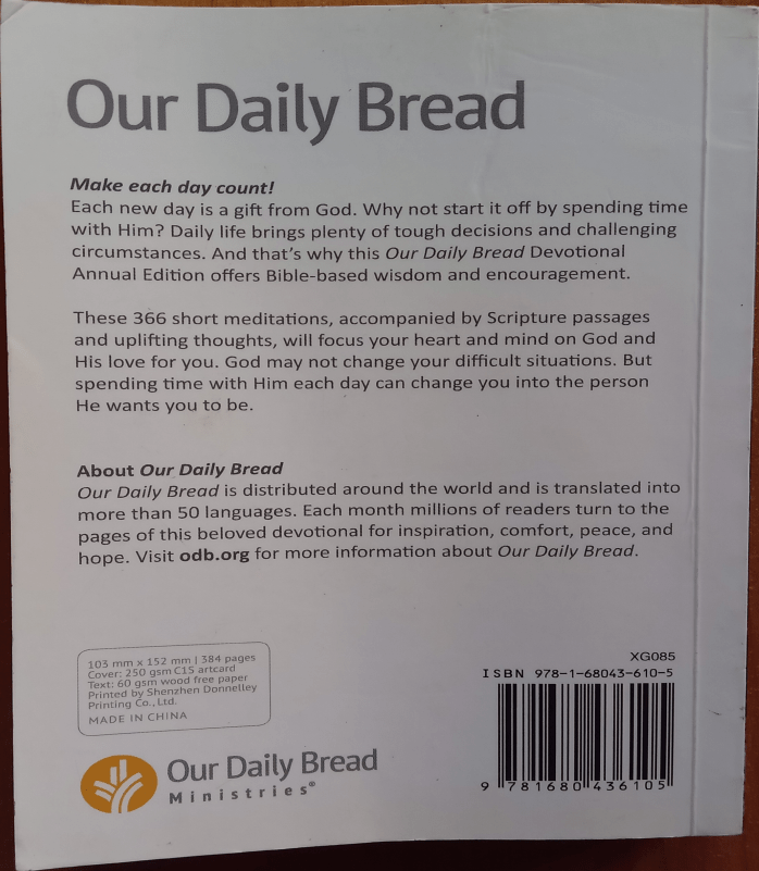 Our Daily Bread is distributed around the world and is translated into more than 50 languages. Each month millions of readers turn to the pages of this beloved devotional for inspiration, comfort, peace, and hope.